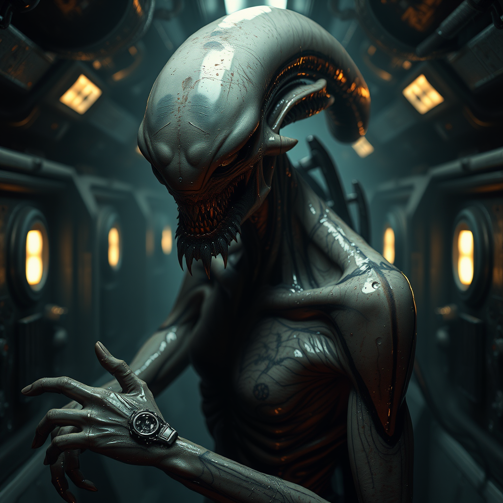 Masterpiece of a terrifying alien creature with otherworldly skin and attire, set in a moist and misty, intricately detailed spaceship corridor. Sci-fi elements with flickering halogen lights cast in muted dark tones, creating a high dynamic range. The creature strikes an aggressive yet sultry pose, showcasing its full body with a flawless face and form. Alien tattoos, scars, and smudges cover its skin, which glistens with oil and is detailed to perfection, with reflective textures and wet surfaces. Inspired by The Alien film franchise, the creature embodies photorealism and hyperrealism, akin to HR Giger's work, captured in 8K UHD, RAW format. The image benefits from octane rendering and is concept art that has been expertly color graded to achieve a muted LUT aesthetic. Artists Aaron Horkey and Jeremy Mann inspire this creation. The creature's anatomy is intact, with no mutations, extra or missing limbs, maintaining a cohesive and striking visual despite creative embellishments.