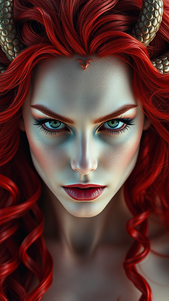 Transform Medusa from Marvel Inc. into an extreme vivid fantasy realism style masterpiece, capturing her in hyper-realistic fantasy digital photography. The depiction is meticulously crafted with precision, centering her in perfect composition. The overexposed photography infuses a striking and ethereal atmosphere, with sharp focus accentuating the exquisite details. Her iconic red hair is clear and bright, while her expressive eyes convey both regal command and inner turmoil. The intricate details showcase her flowing hair and formidable pose, seamlessly merging realism with fantasy. This visual celebrates the essence of her power and inner conflicts in a stunning and imaginative setting, with subtle creative enhancements that breathe new life into her character.