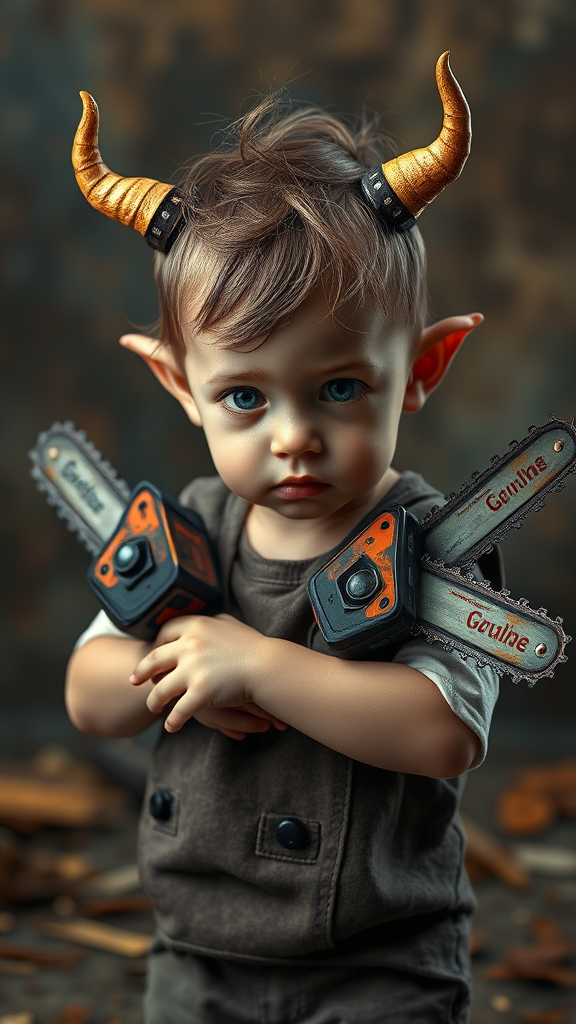High-quality photorealistic image of a child with a surreal touch, featuring chainsaw arms in a dynamic full-body pose. The scene captures a sharp 8k focus with HDR effects, blending elements of whimsy and the bizarre. The child has small horns adding a fantasy flair, while maintaining balanced and harmonious proportions. The composition highlights unique features like large expressive eyes, with an emphasis on creativity without veering into the grotesque. The focus on maintaining realistic anatomy and lifelike details contrasts against the fantastical setting. The background complements the central figure, avoiding any text, logos, or watermarks, ensuring a clean and professional presentation. The overall mood captures an intriguing mix of innocence and otherworldliness, maintaining clarity and structure in its visual narrative.