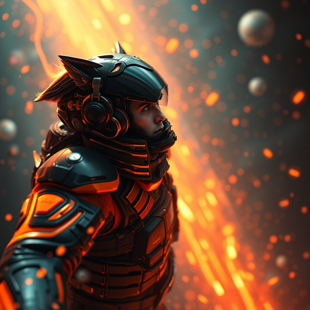 A cinematic masterpiece capturing a breathtaking scene of a futuristic pilot in a 3D anime-style artwork, falling backwards into the mystical tapestry of the cosmos. The pilot's suit, resembling an intricate design from a science fiction anime, exudes an aura of surreal fantasy, with its black and fiery orange color scheme echoing cosmic flames. The suit features a heavily armored appearance complemented by an aggressively designed wolf-like helmet, embodying a sense of mysterious power. This digital artwork, a synthesis of illustrative and painterly techniques, dazzles with vibrant, psychedelic details rendered in octane: from the glossy shine of his armor to the dramatic volumetric lighting and reactive core highlights. The scene captures the pilot's panicked expression amidst ethereal light flares and a moody, high-budget cinematic atmosphere. In this vivid dreamscape, a shallow depth of field enhances the visual complexity, creating a stunning bokeh effect adorned with film grain. The scene is vivid yet mysterious, encapsulating a moment of fear and wonder as he tumbles through cosmic abysses.