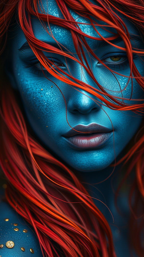 A mesmerizing scene of a woman adorned in blue paint, her striking red hair cascading like a fiery waterfall. Her distinct facial features are rendered in hyperrealistic detail, reminiscent of vibrant marine life. The hauntingly beautiful composition is enriched with the interplay of dark gold and bright gold hues, weaving through her serene expression. This fantasy-inspired illustration captivates with its fusion of orange and gold accents, creating an ethereal aura that is both otherworldly and exquisite.