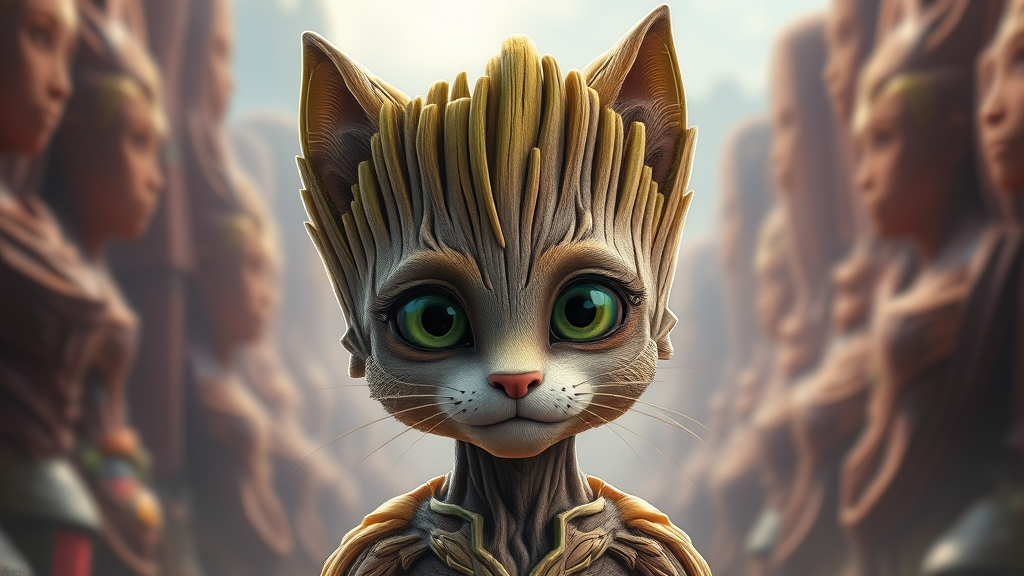 A hyper-realistic movie poster featuring an anthropomorphic character with the head of a feline, combined with a humanoid body. The character resembles Marvel's cute Groot in charm and appeal, showcasing high detail and dynamic expression. Rendered with octane realism, the poster excludes human faces and features, focusing instead on the unique blend of cat-like features and whimsical, cartoonish elements. The backdrop suggests an epic, adventurous setting, full of vibrant colors and textures, enhancing the fantastical aura of this imaginative humanoid cat character.
