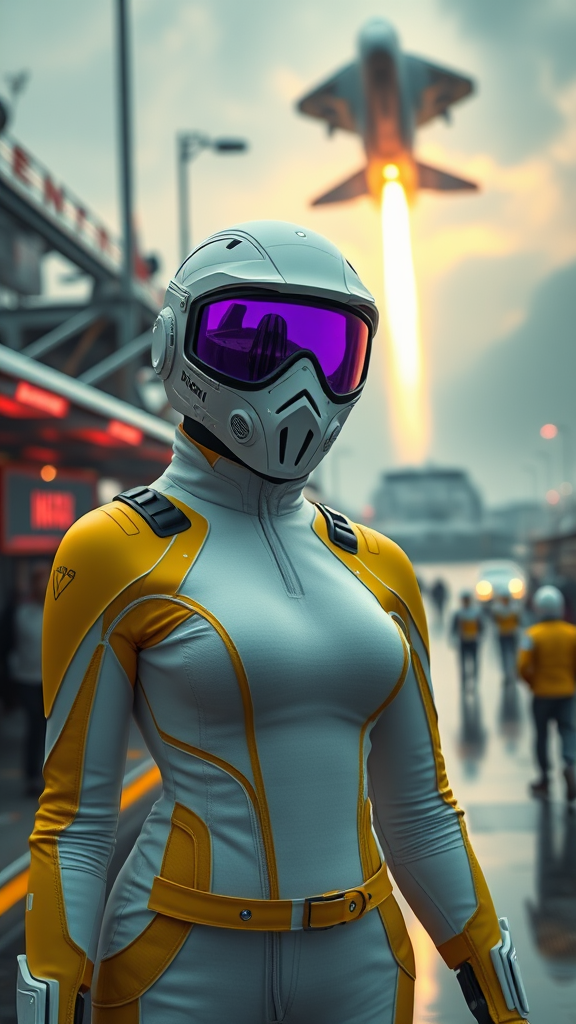 Female in a form-fitting white and yellow intricately detailed jumpsuit stands at a bustling spaceport, with a massive ship taking off dramatically in the background. She dons a sleek mask and a vibrant purple sci-fi visor, complete with an advanced sci-fi lens and respirator. The scene is trending on ArtStation for its extreme details and cinematic aura, creating a stunning environment. The atmosphere is smooth and surreal, almost as if divine and celestial elements are at play, reminiscent of manga and anime styles. The setting bursts with intricate details and rich colors, enhanced by cinematic lighting. It is hyperrealistic, as if rendered in Unreal Engine 5, with impressive lumen reflections and CGI work. The image captures a doll-like quality with its meticulous craftsmanship, expertly rendered with Octane. However, slight imperfections exist—occasional text errors, cropping issues, and blurred areas—that add a unique artistic charm, giving it a raw and intriguing edge.