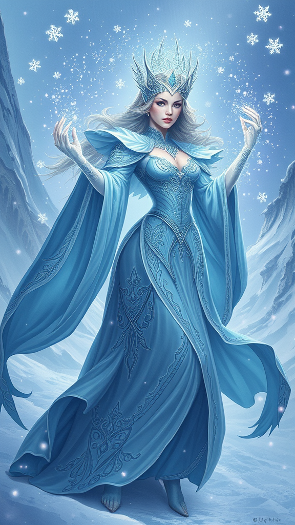Ice Queen sorceress in a fantasy realm, intricate and elegant design in her flowing icy blue gown, surrounded by magical snowflakes and a mystical aura, highly detailed digital painting capturing the essence of a powerful and graceful ruler, artstation style with inspiration from hearthstone and the detailed, ornamental elegance of art by artgerm, greg rutkowski, and alphonse mucha, crisp and sharp focus, illustration with 8k resolution depth, set against a majestic snowy landscape with ethereal light.