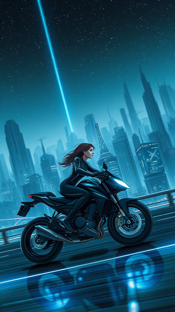 A young woman in a form-fitting, futuristic jumpsuit astride a sleek, sci-fi motorcycle, racing across a vast bridge under the shadow of a ravaged, sprawling sci-fi cityscape filled with looming skyscrapers. The scene is steeped in an apocalyptic atmosphere, reminiscent of Tsutomu Nihei's signature style, with elements of gigantism and multi-layered architecture. Neon-lit power lines weave through the darkened skyline, casting an otherworldly glow on the modern ruins. Above, a star-lit sky blankets the scene, punctuated by an ominous blue energy beam arcing through the distance. The composition is rich in detail, capturing the high-definition clarity and intricate artistry associated with manga graphics, infused with anime influences. A side view reveals the depth of the environment in Full-HD, as blue neon lights reflect off gleaming surfaces, creating a sense of kinetic energy and dynamic motion in this stunning 8K vision of a dystopian future.