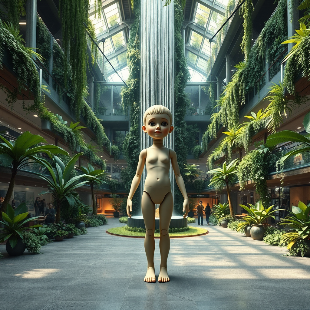 Epitome of biophilic design, public space, vast atrium with lush greenery, cascading indoor waterfall, verdant elements throughout, created in Unreal Engine with photorealistic CGI. Render features a 3D doll at its center. The scene employs Octane rendering, characterized by intentional low resolution and textural errors for an abstract effect. Imperfections such as cropped visuals, jpeg artifacts, and abstract duplication lend an unconventional charm. The doll displays surreal traits like extra fingers, elongated neck, and asymmetrical features. These artistic distortions, including mutated limbs and exaggerated anatomy, challenge traditional perception, creating a unique juxtaposition against the serene natural surroundings. The result is a captivating, dreamlike space that redefines biophilic interiors.