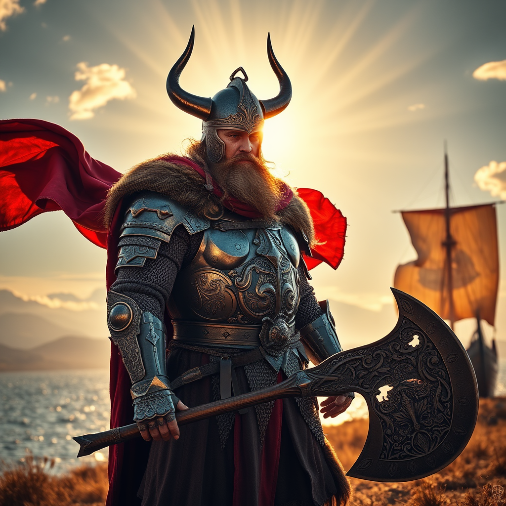 A majestic Viking king stands proudly, adorned in intricate armor with an ornate horned helmet, set against a vibrant, sunlit Scandinavian landscape. The scene is alive with dynamic movement as the king's crimson cape billows in the wind. Ultra-detailed engravings on his armor catch the light, showcasing expert craftsmanship. He grips a massive, ornately decorated axe, its blade gleaming under cinematic lighting. Volumetric rays filter through the misty air, casting ethereal patterns around him. The bright colors of the scene contrast with the dramatic HDR shadows, enhancing the king's regal presence. In the background, a longship with billowing sails drifts on a glimmering fjord, bathed in the golden hues of an eternal sunset.
