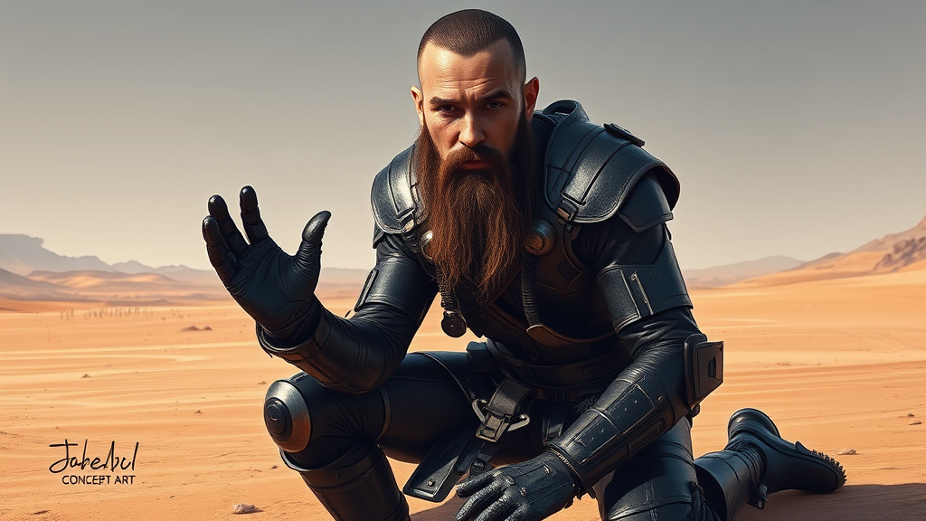 Full-length portrait of a bearded man wearing sleek sci-fi leather armor, kneeling in a vast desert setting. The scene is gothic-inspired with a focus on a detailed face. The artwork features cinematic lighting, capturing the essence of digital art and character design, illustrated as concept art. The image is intentionally low-res with text elements and subtle errors, featuring missing fingers, extra or fewer digits. The composition is slightly cropped, containing JPEG artifacts and a signature. Anatomy is flawed with extra limbs or fingers, and hands and feet are drawn with imperfections. Parts are disfigured or out of frame, with tiling, creating a deformed and mutant aesthetic. The overall appearance is intentionally blurry and fuzzy, contributing to a misshaped, grotesque, and bizarre visual, with subtle hints of a watermark.