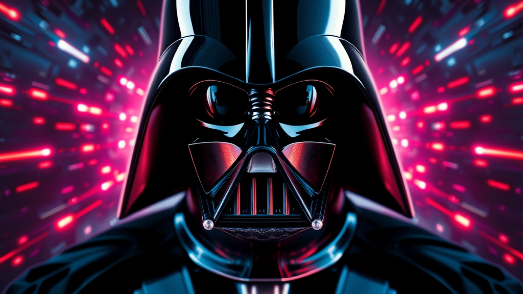 Symmetry inspires a striking portrait of Darth Vader from Star Wars, set in a sci-fi universe with glowing lights that cast an ethereal glow. The image is intricate and elegant, showcasing highly detailed craftsmanship. This art could be a high-resolution photograph, reminiscent of ArtStation galleries, capturing the dark allure and imposing presence of Vader. The balance and harmony in the composition highlight the iconic helmet and breath apparatus, possibly set against a backdrop that emphasizes his formidable silhouette. Vibrant energy trails accentuate the futuristic theme, blending classic and modern design elements seamlessly.