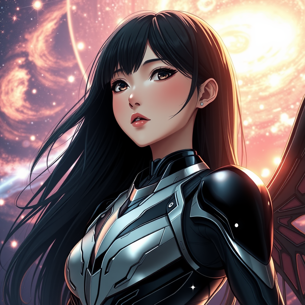 A stunning close-up portrait of a beautiful girl in a sleek, futuristic exo-suit, featuring a captivating, dreamy expression. Her long, black hair flows smoothly, complementing her slender silhouette as she gazes thoughtfully into the cosmic distance. She wears a sophisticated, glossy black and silver insectoid-inspired sci-fi mech suit, complete with intricate sci-fi wings in an insectoid style. The design is reminiscent of Tsutomu Nihei and Akira's iconic styles, capturing a vivid and immersive scene bathed in bright quasar light. Set against the dramatic backdrop of outer space, the image is enhanced with volumetric graphics that create a rich anime and manga aesthetic. The environment crackles with vibrant space starlight, swirling galaxies, and dynamic plasma beams. Presented in hyper-realistic 8k UHD, the composition highlights complex lighting and mesmerizing effects, crafting an epic, otherworldly vision.