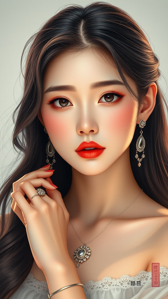 Beautiful Korean woman, inspired by kpop idols, characterized by dramatic lighting and symmetrical features, captured in a realistic, sharply focused, HD detailed portrait. The imagery emphasizes hyperrealism with intricate details and physics-based rendering effects, showcasing elegant jewelry. Incorporates elements of CGI and 3D artistry, blending with the charm of dolls, cartoons, and anime. The illustration conveys artistry through digital painting techniques, ensuring none of the imperfections like low resolution, text errors, or deformed features are present. The composition avoids any unnatural anatomy or duplicated elements, focusing on balanced proportions and graceful depiction.