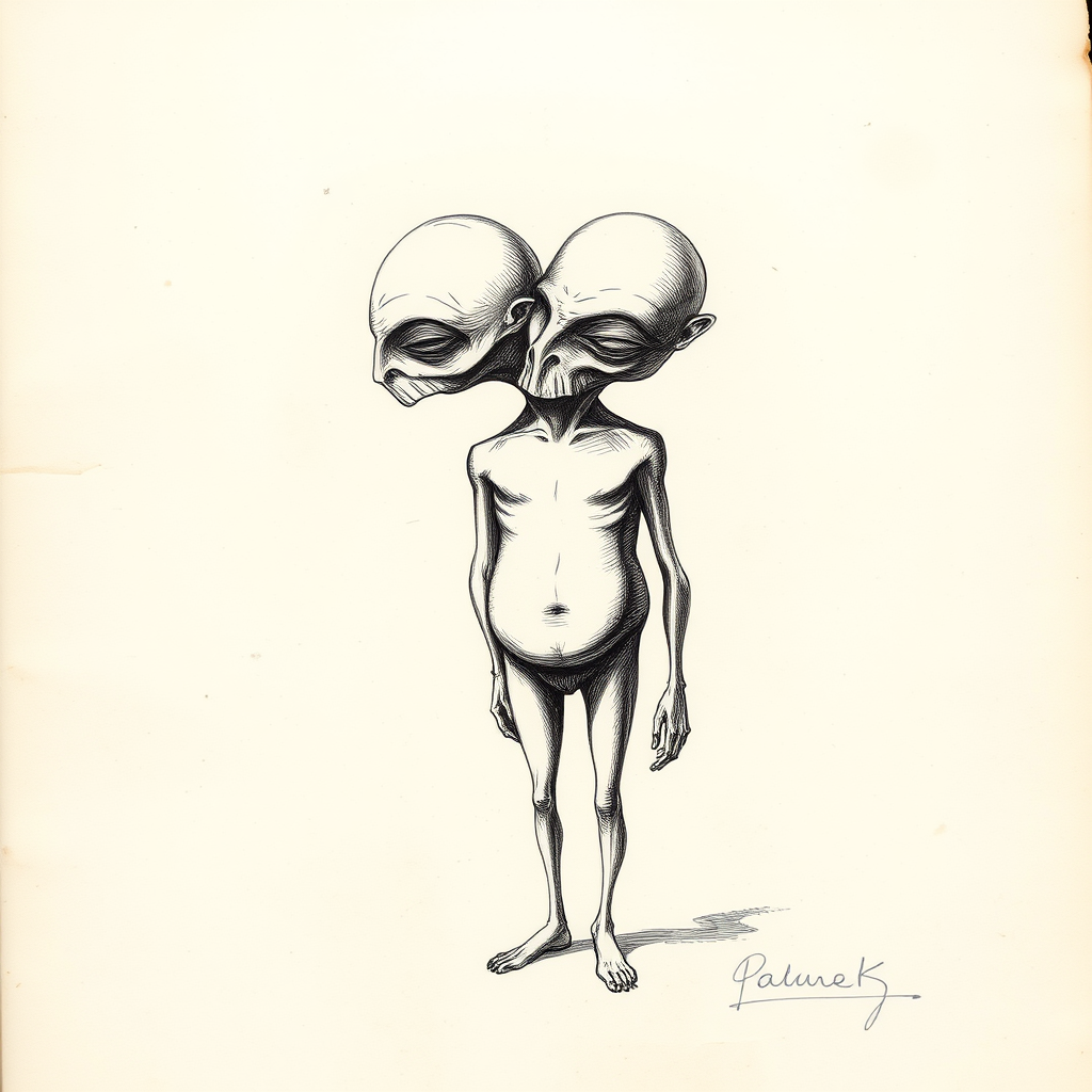 A black and white drawing on old paper from the 1890s, depicting a peculiar, double-headed figure with an oddly cropped body, showcasing an unusual and surreal form, complete with a vintage signature and watermark, exuding a sense of timeless mystery.