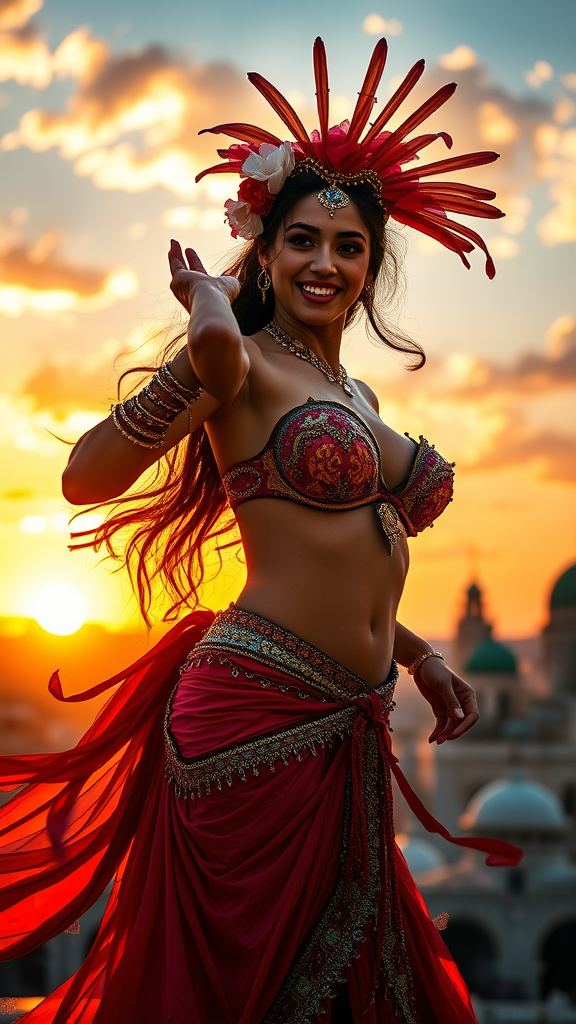 Volumetric lighting, golden hour sunset, full body portrait, joyful woman with a radiant smile, exuding charm and elegance, enchanting venetian carnival theme, dynamic and graceful, a spirited fighter with poise, vibrant sunset hues, rendered in high resolution with hyper-realistic details, embodying the dual essence of a captivating bellydancer and fierce warrior, reminiscent of an oil painting by Frank Frazetta, enchanting skyscape with clouds inspired by Albert Bierstadt, capturing drama and beauty, a harmonious blend of strength and elegance.