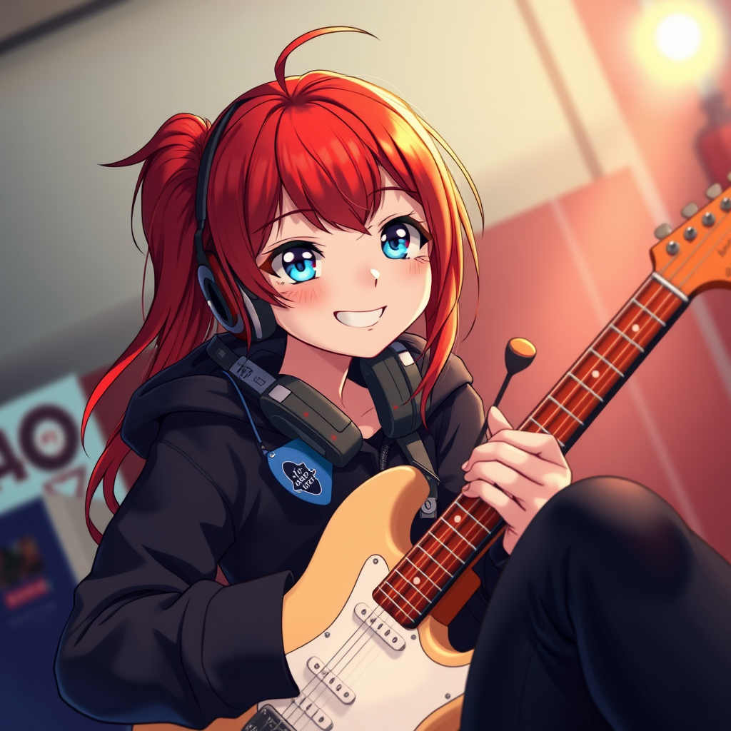 Photo of a redheaded Asian girl smiling flirtatiously at the camera, wearing black pants and a hoody with blue eyes shining. She is adorned with headphones around her neck, holding a plectrum and strumming a guitar. The scene is captured in hyper detail with intricate features and a slightly blurry, dynamic angle that enhances the dramatic lighting and high contrast. Her long hair is styled with one side up, and she has striking red lips. The perspective is a full body cowboy shot in a vibrant, anime-inspired cartoon style.