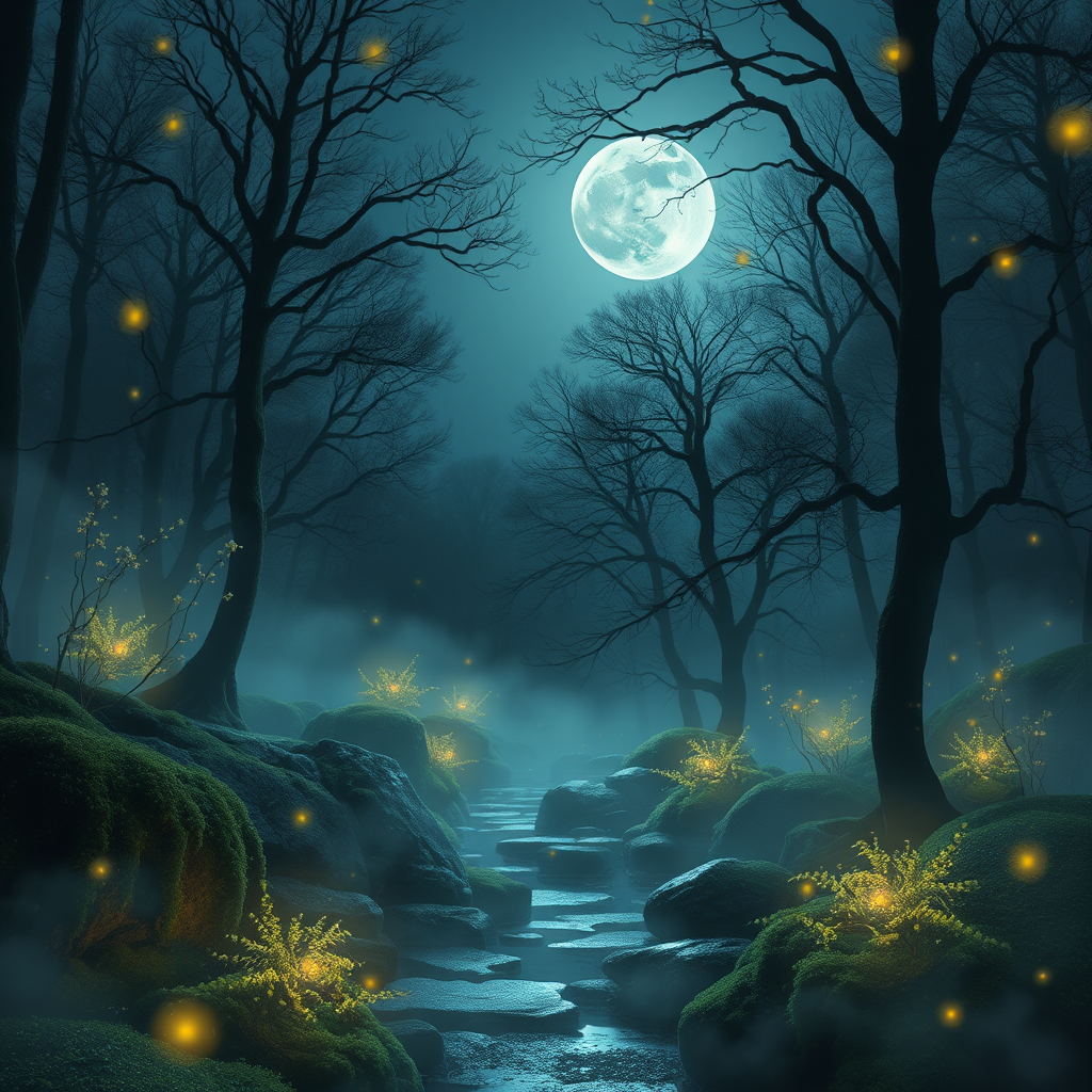 Floating gently through a mist-laden forest alive with the flicker of fireflies, where glowing flora and moss-covered stones blend with the silhouettes of ancient trees under a deep indigo sky, visiting a world of glistening dew kissed by gentle moonlight, capturing an ethereal essence with an otherworldly glow.