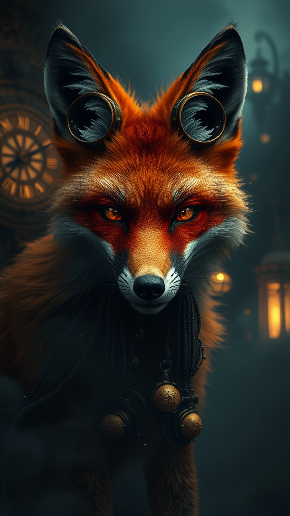A steampunk red fox in a hauntingly detailed Lovecraftian world, with intricate mechanical elements and mysterious clockwork features, enveloped in a dark, moody atmosphere. Captured in the style of hyper-realistic digital art, utilizing Unreal Engine and ray tracing to achieve exquisite detail and depth. The setting is filled with intense shadows and low-key lighting, creating a dramatic, cinematic effect. The fox's eyes glimmer with an otherworldly intelligence, set against a backdrop of swirling mist and ethereal lights. The composition is wide angle, combining the intricacies of concept art and the realism of portrait photography, showcasing excessive detailing and sharp focus. Magical ambiance mingles with steampunk aesthetics, featuring volumetric lighting and a soft, natural glow illuminating select features. This surreal landscape is a testament to both horror and wonder, where magic meets machinery, trending on ArtStation for its compelling concept and masterful execution.