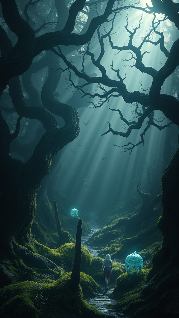 A breathtaking scene unfolds in a dark fantasy realm, captured in Full HD and 8K resolution. The enchanting landscape is rendered in exquisite detail, akin to concept art from an Unreal Engine masterpiece, and it is currently trending on Artstation. Volumetric lighting casts ethereal beams, piercing through the dense canopy of ancient, twisted trees. Shadows dance across the moss-covered ground, where mythical creatures lurk and mystical flora glows faintly. The atmosphere is charged with a sense of mystery and wonder, inviting viewers into a world where realism and fantasy converge.