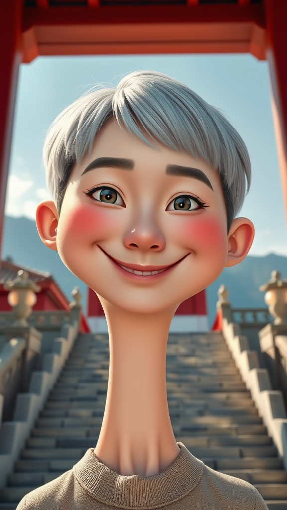 ganyudef upper body smile blush outdoors day clear background bright sky short hair scenic temple gazing at viewer stone stairs mountain serene lighting 8k UHD HDR duplicate mutation altered cloned face slightly cross eyed elongated neck extra fingers unusual hands lowres out of frame soft focus compression artifacts no watermark no logo no text cropped cartoonish split images
