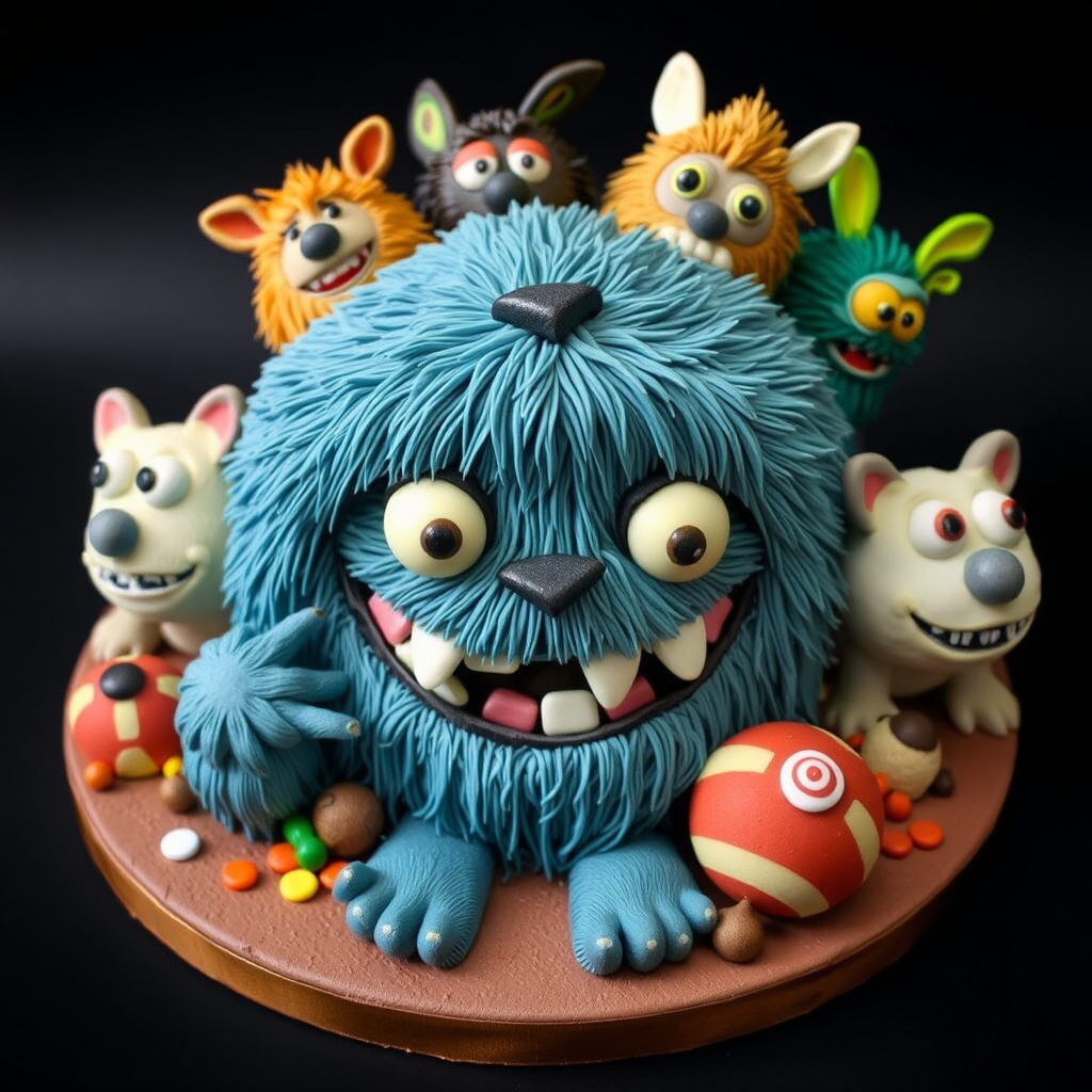 "Sculpted cake resembling critters from a mischievous creature film, featuring a detailed, playful exterior that mimics fuzzy textures and vibrant eyes, surrounded by edible elements hinting at a cinematic adventure."
