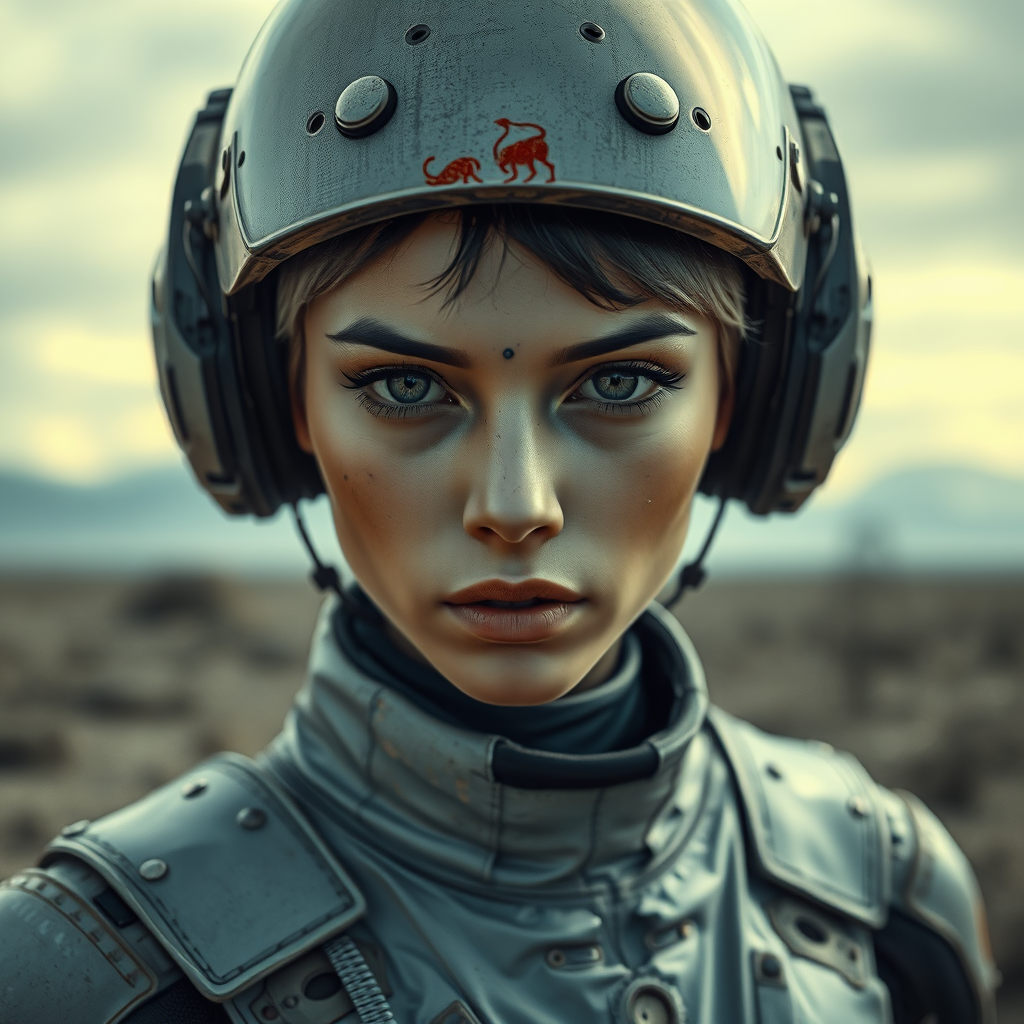 female in a futuristic radiation suit stands in a desolate post-apocalyptic landscape, eyes locked on the viewer, portrait style akin to high-resolution photography, skin texture intricately detailed with lifelike appearance, capturing an essence of reality in 8k, image brimming with detail, full-length frame captures the essence of survival, color art in RAW high detail, subtle piercings add character, soft diffused lighting suggests a somber mood, depth of field is shallow, focus sharp, enveloped in hyperrealism, cinematic lighting enhances atmosphere, avoid low quality features such as text overlays, visual distortions, poor framing, anatomical inaccuracies, or any form of physical distortion, maintaining clean composition with accurate proportions and natural appearance.