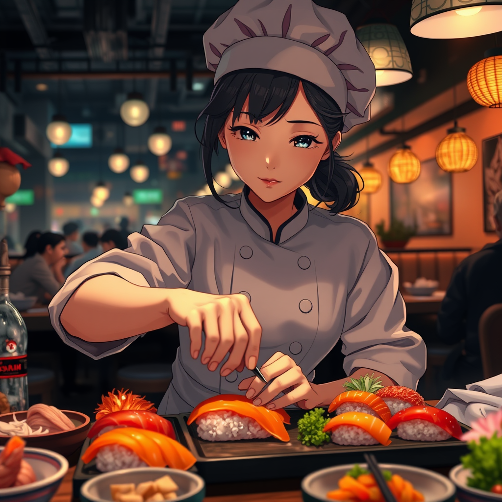 A vibrant portrait of a female chef expertly crafting sushi at her restaurant during a bustling night. The scene captures an anime-inspired style, echoing the aesthetics of Lois van Baarle's work. The setting is intimate, filled with a warm ambiance as she meticulously arranges fresh ingredients. Her expression is focused and calm, exuding confidence and passion for her craft. The dim lighting casts soft shadows, highlighting the intricate details in her traditional chef attire. Despite the low resolution, the image retains its charm through rich colors and dynamic composition. Her graceful hands move with precision, devoid of any anomaly, perfectly suited to her culinary art. The background suggests a lively restaurant atmosphere, with hints of fellow patrons and ambient sounds muted into a harmonious blend of shapes and colors. The portrayal is crisp, devoid of any imperfections, errors, or distractions such as anomalies or unnecessary elements, resulting in an evocative and enchanting visual story.