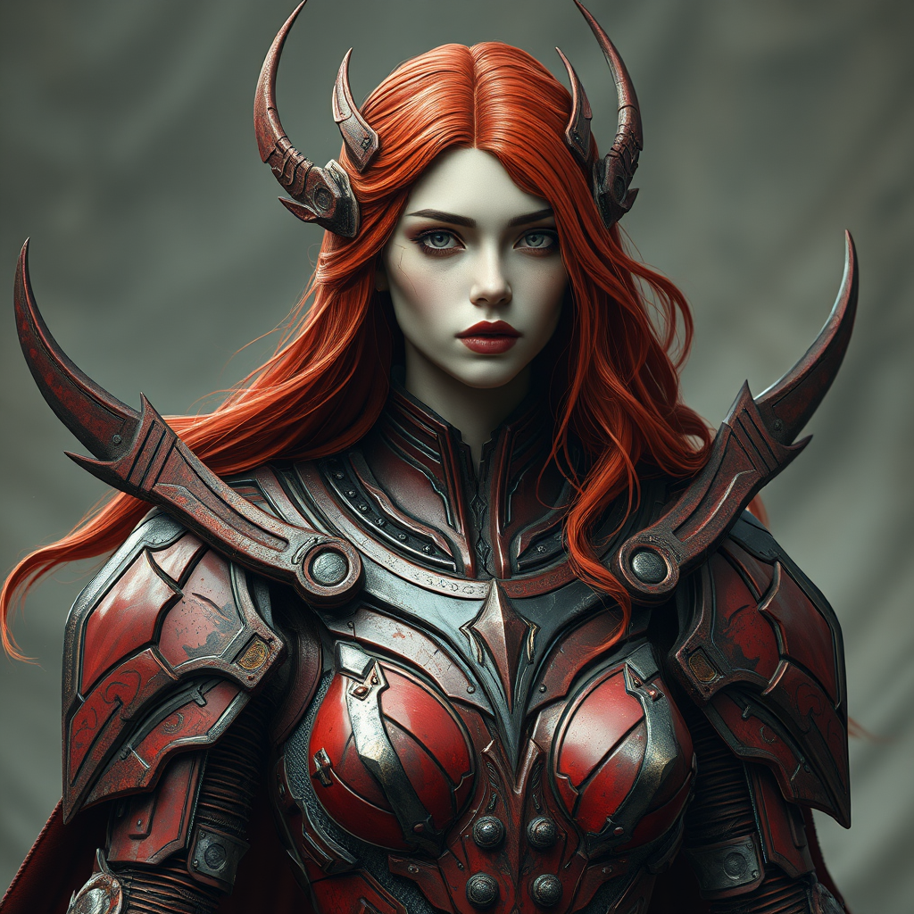 goddess warrior knight sci-fi beautiful futuristic space armor divine celestial ultra-realistic battle-worn red intricate elegant realistic hyperrealistic cinematic highly detailed lowres elements of decay and distortion with hints of jpeg artifacts and text errors in the background. Her form is slightly misshaped, displaying a blend of extraordinary and surreal characteristics, exhibiting occasional anatomical anomalies. An enigmatic aura surrounds her, with traces of elaborate but imperfect artistry, occasionally blurred or fuzzy, evoking a sense of otherworldly beauty amidst chaos.