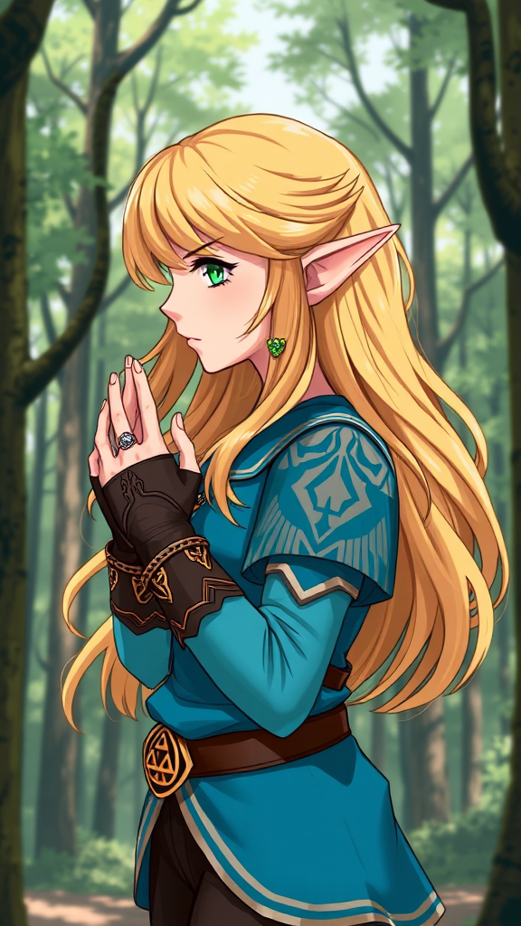 princess zelda, one girl, bangs, blonde hair, petite figure, elegant gauntlets, serious expression, profile view, emerald eyes, high resolution, ornate jewelry, flowing hair, long sleeves, video game character, natural setting, clasped hands, pointed ears, intricate ring, serene posture, the legend of zelda theme, amidst trees, triforce design, portrait, blue tunic and dark trousers, clean image quality, refined composition, attention to detail.