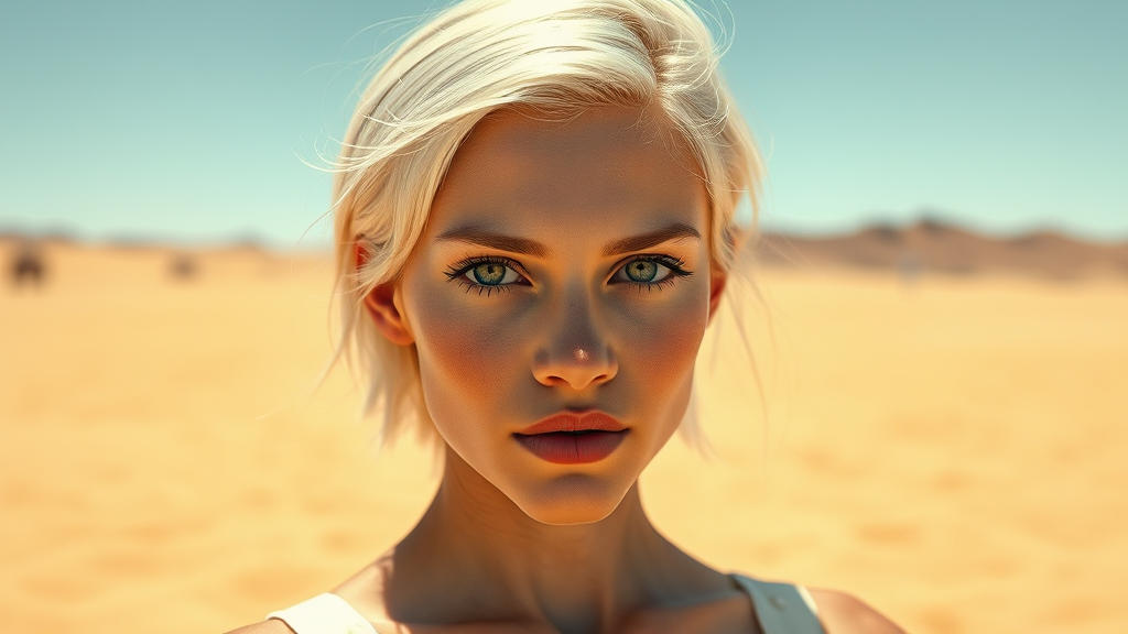 A young Caucasian woman with platinum blonde hair stands in a vast, desolate desert landscape, under a clear, azure sky. The scene is imbued with a sci-fi essence and rendered in hyperrealism, capturing the intricate details of her features and surroundings. Her expressive eyes reflect curiosity and resilience, set against her sun-kissed complexion. Photographed with an 85mm lens at 8k ultra-high resolution, the image is marked by cinematic lighting that accentuates the texture of her skin and the shimmering grains of sand. The shallow depth of field, achieved with a 50mm lens at f/1.4, softens the background to highlight her focused gaze. The scene evokes a blend of art styles inspired by Artgerm, Greg Rutkowski, and Alphonse Mucha, combining contemporary vibrancy with classical elegance. Although her silhouette is flawless, the composition avoids any discordant elements like distortions or disfigurements, ensuring a cohesive and harmonious visual narrative.