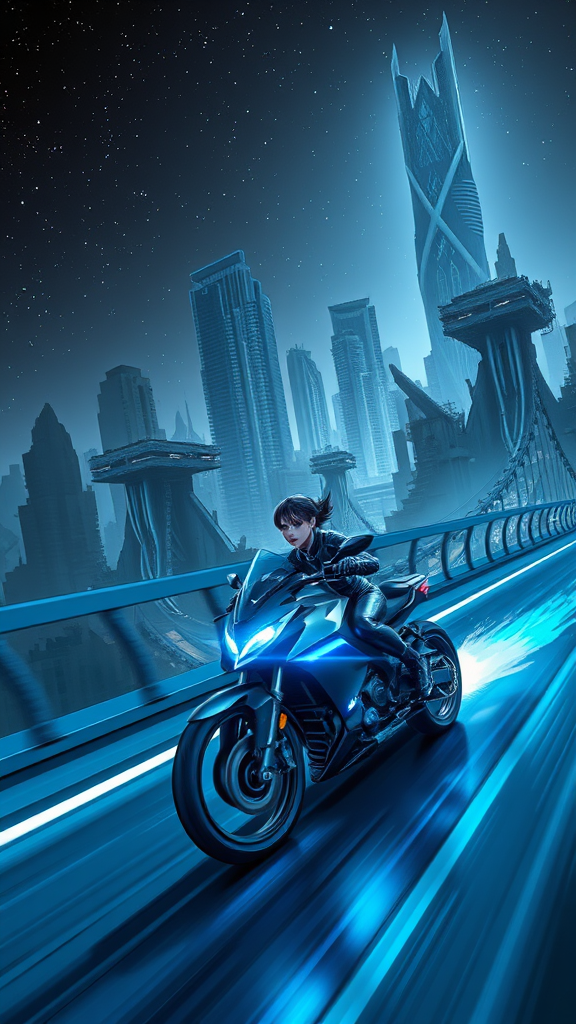 A young woman clad in a sleek, form-fitting sci-fi jumpsuit zooms across a sprawling, neon-lit bridge on her cutting-edge futuristic motorcycle. Her ride glows with bright blue neon accents and emits vibrant energy plumes as it speeds forward, leaving trails of light in the wake. Above her, a ruined sci-fi city looms, its towering skyscrapers stretching into the heavens, broken and majestic against the backdrop of a star-studded night. The scene is shrouded in darkness, with an atmosphere reminiscent of Akira and Tsutomu Nihei's work, channeling the raw, intricate style of ABARA. It's a world of dramatic gigantism and multistory space, where every detail speaks of a once-flourishing metropolis now fallen to ruin. The perspective is immersive, capturing the adrenaline and intensity of the ride. Manga-inspired graphics enhance the imagery with sharp contrasts and deep shadows, while the entire scene is infused with rich blue tones, rendered in the highest quality imaginable, akin to an 8K, Full-HD Plasma display.