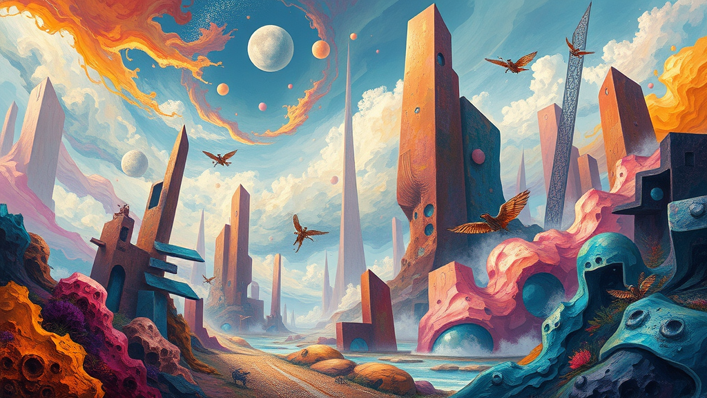 Ethereal landscape with dreamlike elements, a fusion of vibrant colors and abstract forms, capturing the essence of childlike curiosity and whimsical imagination, otherworldly beings floating amidst distorted shapes, blending reality with surreal fantasy, tall elongated structures, rich textures, fluid lines contrast with bold geometric patterns.