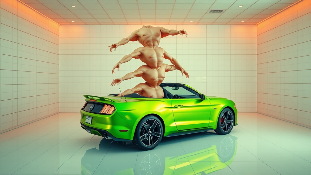 All white tiled room, metallic green Ford Mustang, perfect orange accents, bright and vivid lighting, interplay of pastel colors, intricately detailed, ultra-realistic 8k commercial photography, professional color grading, surreal composition with stacked torsos resembling a totem pole, quirky anatomy with extra and missing limbs, floating and disconnected limbs creating an abstract, mutated form, visually intriguing yet unsettling, with a touch of blurred and distorted elements to evoke a sense of disarray.