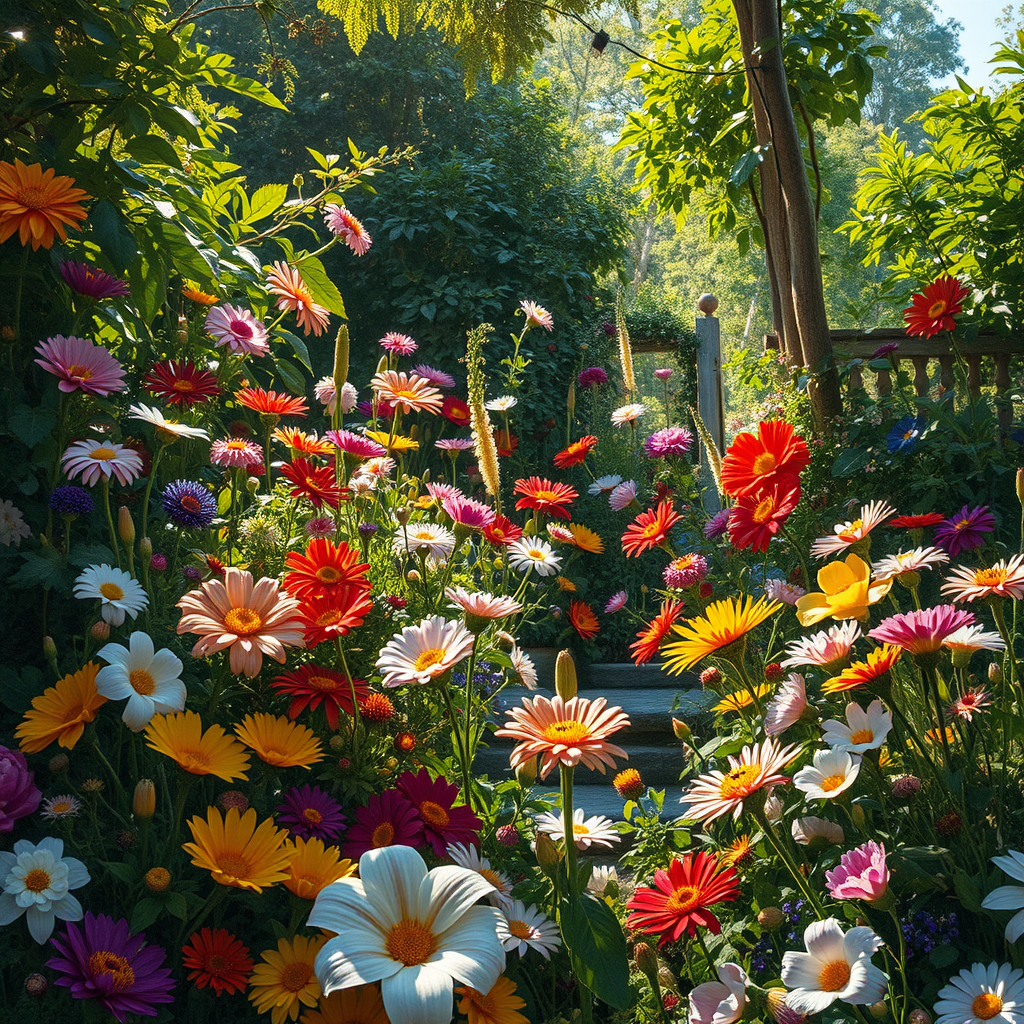 Imagine a vibrant garden teeming with an array of colorful flowers, an enchanting blend of nature's abundance and artistic elegance. Drawing inspiration from the detailed works of Paulina Góra and Rachel Ruysch, the scene is a harmonious convergence of vivid hues and delicate petals. Sunlight filters through lush greenery, casting dappled patterns on the ground. Each bloom, meticulously rendered, boasts intricate textures and striking colors, creating a tapestry of natural beauty. This captivating landscape evokes a sense of timeless wonder, where art and nature celebrate their symbiotic relationship.