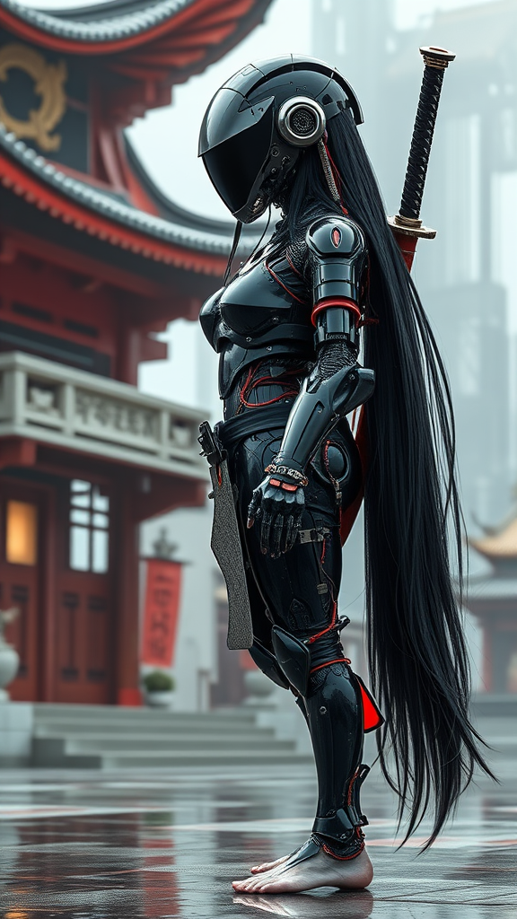 A full body depiction of a female cyberpunk robot samurai stands poised, her design heavily inspired by the ck-sfc style. Her robotic face is shielded by a sleek, mirrored visor, contrasting with the hyperdetailed helmet that encases her head. Her long, flowing black hair cascades down, creating a striking contrast against her reflective black armor accented with neon red highlights. The armor is intricately designed, with visible robot joints intricately connected by a network of metals, cables, and wires. She is barefoot, exuding a grounded yet futuristic aura. A katana is strapped securely to her back, hinting at her readiness for combat. The background is an abstract interpretation of an eastern temple, merging traditional elements with a futuristic touch, enhancing the cyberpunk aesthetic of the scene.