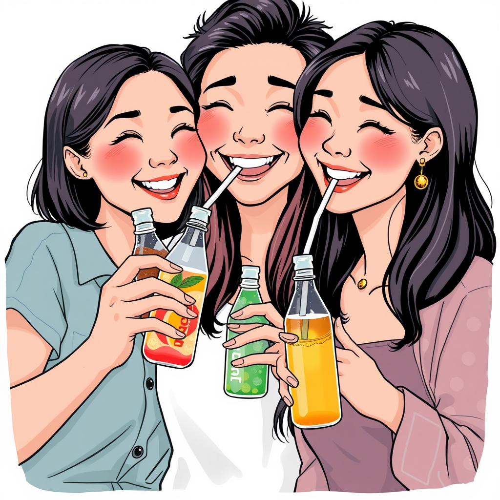Three cheerful Asian friends, two women and one man, are enjoying refreshing drinks from PET bottles. Positioned in the lower right corner, they exude happiness and camaraderie. The scene is depicted in vibrant colors with a focus on their interactions. The medium shot captures their joyful expressions, set against a simple and minimalistic background that enhances the mood. The illustration is created in a vector style, showcasing high resolution and intricate details, subtly emphasizing the unique accessories and clothing of each character.