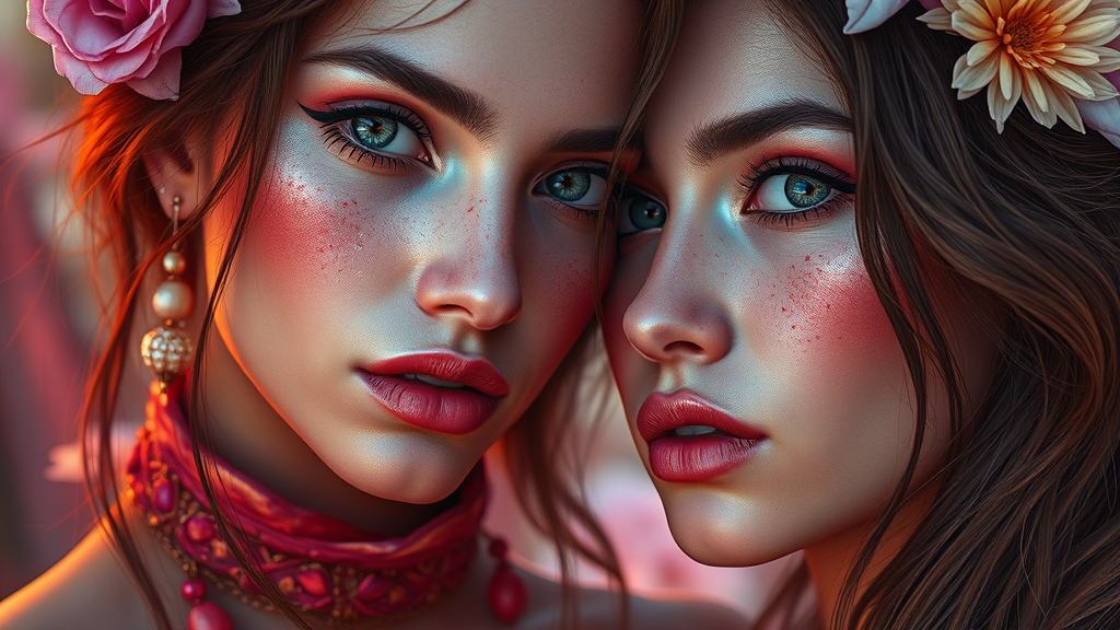 Vibrant digital artwork featuring two women, rendered in colorful fantasy realism with influences from Ivanovich Pimenov and Tanya Shatseva, highlighting magenta and amber hues. The scene captures an exotic realism with intricate details, focusing on a close-up composition that brings out the unique features of both subjects. The image is in ultra-high-definition, showcasing an imaginative blend of lush textures and vivid colors, with a harmonious mix of surreal and lifelike elements, set against a backdrop that enhances the intimate and mystical atmosphere.