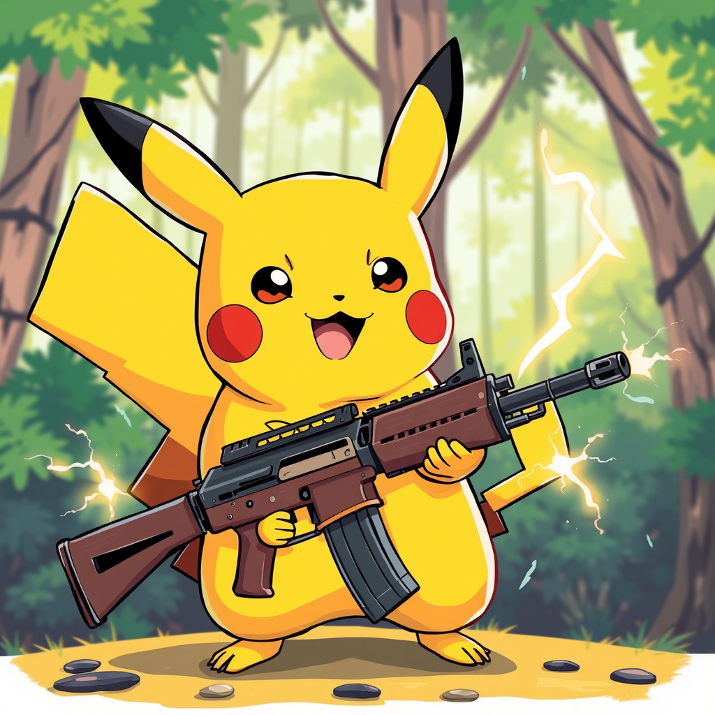 A whimsical illustration of a determined Pikachu, eyes focused with a playful grin, energetically clutching a playful, toy-like AK47, surrounded by vivid sparks of electricity against a vibrant forest backdrop.