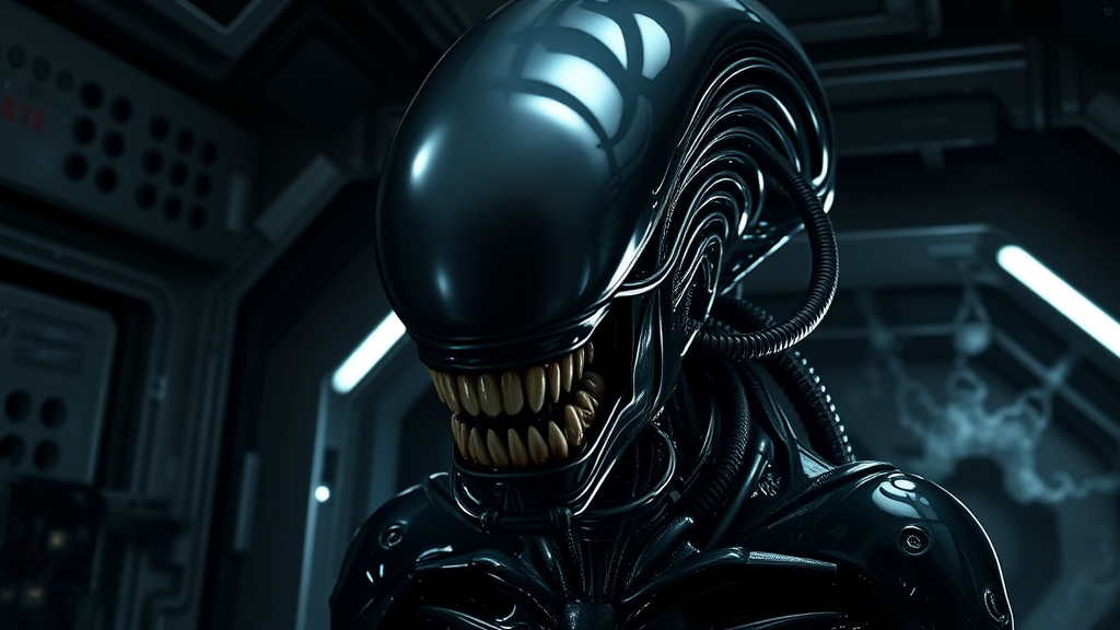 A RAW photo captures a highly detailed portrait of an alien creature inspired by the Xenomorph from the Alien movies. The creature features a sleek, elongated head with a smooth, polished dome-like surface devoid of visible eyes, which adds to its eerie and unsettling appearance. Its mouth reveals short, razor-sharp teeth with a metallic hue, cleverly hiding a second, smaller set of teeth that emerge menacingly, reminiscent of a small black box with sharp edges. Its skin is a glossy, ebony exoskeleton that sinisterly reflects ambient light, adorned with biomechanical ridges and intricate tubes weaving along its head and neck. The backdrop is a shadowy, industrial setting aboard a spaceship, with metallic walls glistening with droplets of water and soft wisps of steam rising, enhancing the creature's ominous aura. Dramatic lighting casts deep shadows over the alien's surface, accentuating its terrifying and otherworldly features, immersing it in its dark, mechanical domain.