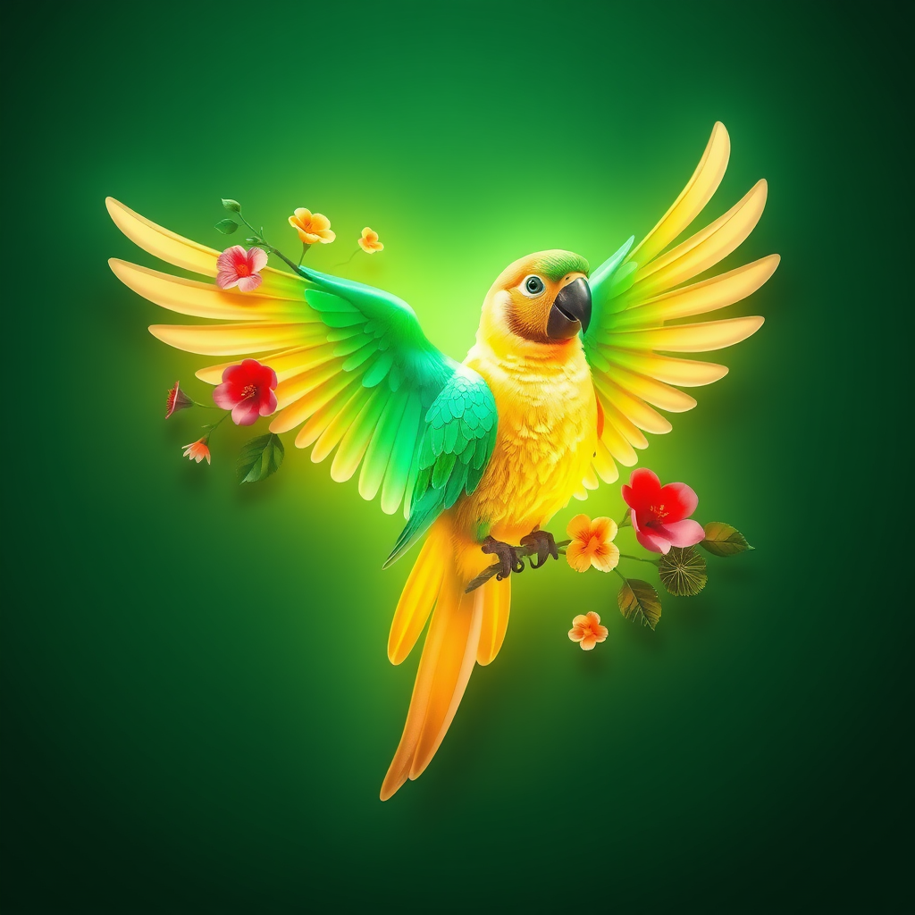 A luminescent abstract 3D parrot with wings seamlessly integrated with vibrant foliage and delicate flowers glides gracefully against a rich emerald backdrop, casting a gentle glow that illuminates its surroundings.
