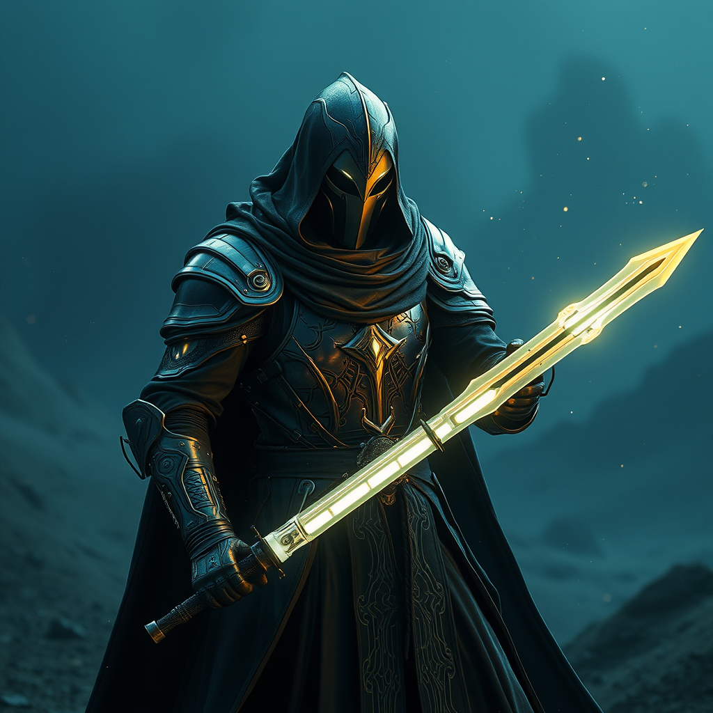 A futuristic medieval knight adorned with intricate cybernetic enhancements, clad in sleek, flowing robes with luminous patterns woven into the fabric. The knight wields a glowing, ethereal weapon that hums with a mystic energy, seamlessly blending arcane magic with advanced technology. The scene is set in a dimly lit, otherworldly landscape where the air shimmers with a faint luminescence, casting a photorealistic, cinematic aura that enhances the sci-fi fantasy fusion. The warrior's stance is poised and powerful, exuding an aura of both ancient wisdom and cutting-edge innovation.
