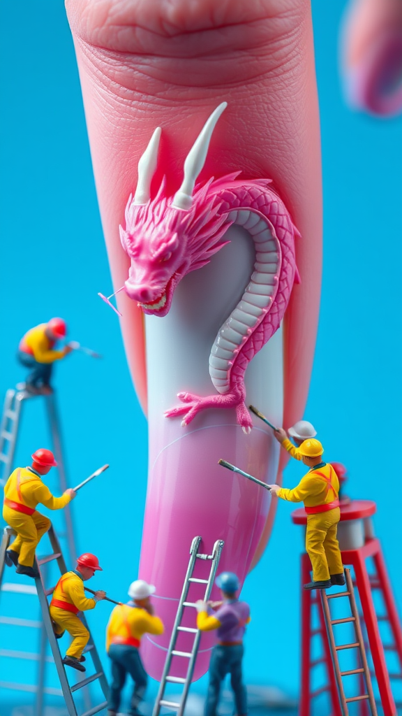 Miniature workers clad in colorful uniforms diligently embellish a stranger-than-fiction tiny scene: they meticulously paint an enchanting ombre pink dragon across oversized fingernails, wielding brushes so large they resemble garden tools in their hands. Some workers polish with miniature cloths, bringing out a glossy sheen. They work from ladders and compact scaffolding, all executing their tasks with the precision of skilled artisans restoring a grand masterpiece. The backdrop is a vibrant, electric blue, offering a stunning contrast, infusing the scene with a dreamy, ethereal quality. This tableau marries faithfulness to reality with a touch of whimsy, inviting viewers into its cinematic world with hyper-real textures and an artful, whimsical charm.