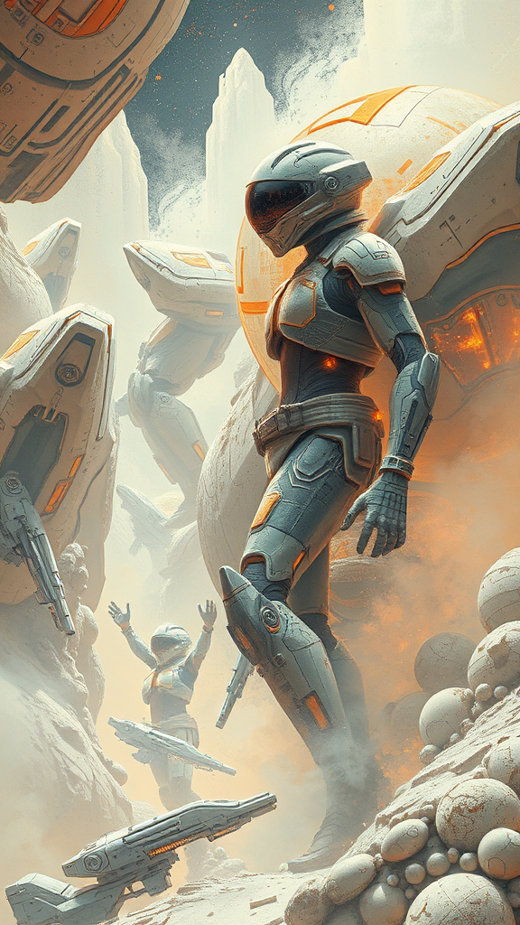 Intricate sci-fi artwork inspired by Roblunda McCallum, featuring a full-bodied figure engulfed in a palette of dark white and light orange hues, embodying sci-fi realism with a hint of pulp comics flair. The scene captures blink-and-you-miss-it details, showcasing meticulous airbrush and comic art techniques. The composition blends the expansive feel of a cinematic universe with vibrant realism, inviting viewers to explore its intricacy and layered storytelling.