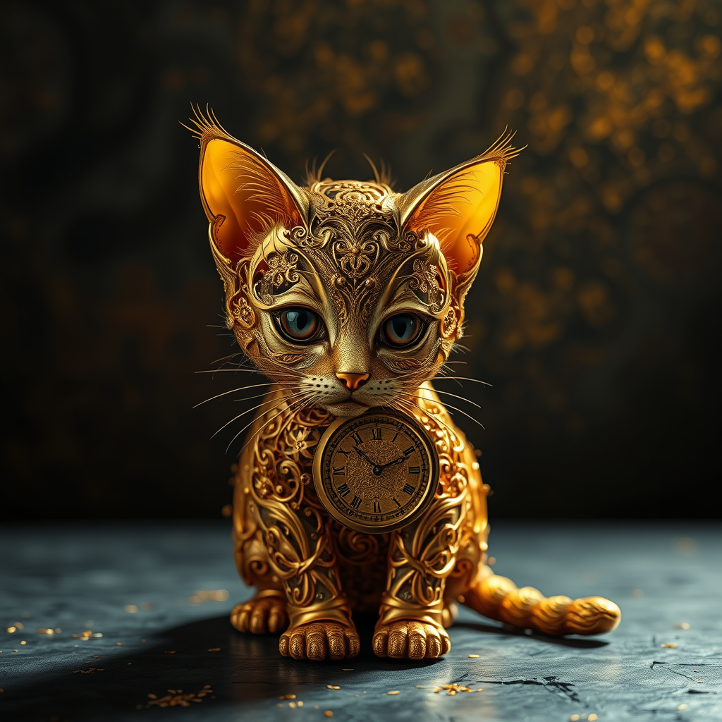A photorealistic depiction of a kitten crafted entirely from intricate gold clockwork and delicate golden filigree, set against a richly textured abstract dark background. The scene is rendered with high detail and vibrant chiaroscuro, capturing the balance of light and shadow in cinematic style. The long exposure technique enhances the image's hyper-realism, giving it a sense of motion and life. The composition is presented in stunning 8K super resolution, showcasing every minute detail, with an aspect ratio of 1:1 to create a perfectly balanced visual harmony.