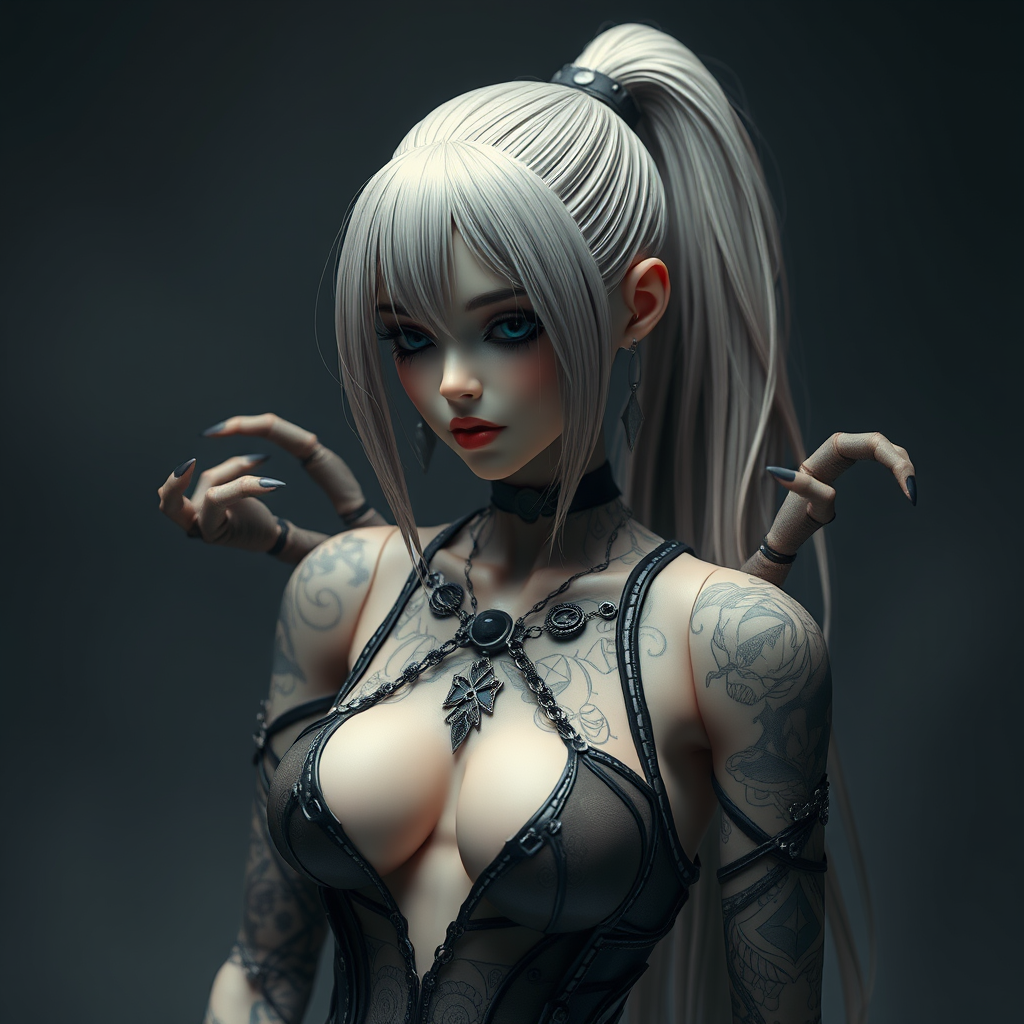 Full body ethereal steampunk with dark dystopian background, cyberpunk influence, detailed tattoos, realistic sharp focus, high definition, intricately elegant design, seductive attire partially concealed, facial features slightly distorted, elongated hair in a sleek ponytail, 3D doll-like appearance with octane rendering, subtly imperfect anatomy featuring additional limbs and fingers, hands with unconventional design, abstract tiling, and a hint of mutation for an otherworldly effect.