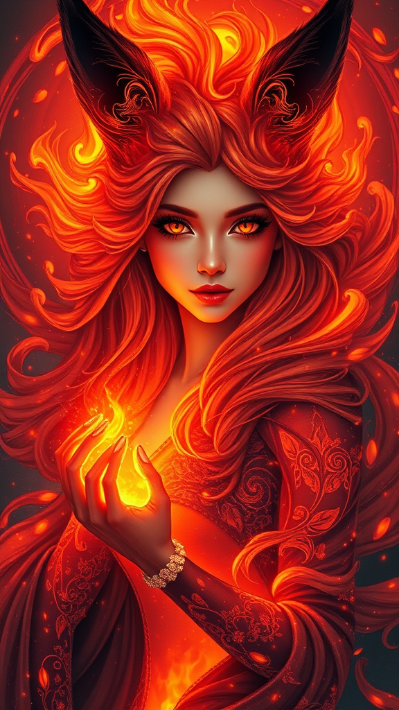 A breathtaking full body portrait of a fox lady composed of swirling magma and lava, with a glowing aura, inspired by Charlie Bowater's style. Featuring a volumetric atmosphere, this digital art piece boasts best quality sharp focus, showcasing a beautiful face and elegant, delicate hands. High-resolution and vibrantly intricate, it is insanely detailed with precise line art and a comprehensive cinematic feel. With max detail, this 4k UHD masterpiece is award-worthy and trending on ArtStation, capturing a dynamic pose with remarkable clarity. The portrait is free from imperfections such as missing or extra limbs, blur, poor anatomy, or any artifacts, ensuring a flawless, stunning representation without any text, signatures, or watermarks.