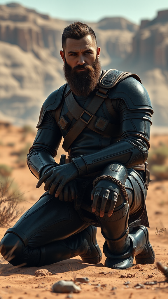 A full-length portrait of a bearded man wearing sleek sci-fi leather armor, depicted kneeling amidst a desert landscape. The scene is rendered with a gothic aesthetic, highlighting a detailed, expressive face under cinematic lighting. This digital art showcases character design and concept art qualities, though it may contain artistic imperfections like jpeg artifacts, missing fingers, extra digits, or cropped elements. The image may also display errors such as poor anatomy or disfigured features, possibly out of frame or blurry. Additionally, there might be unintended inclusions like signatures or watermarks.