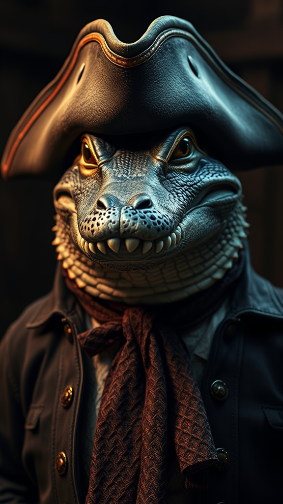 A highly detailed and realistic portrait of an anthropomorphic alligator dressed in 18th-century pirate attire, complete with a rugged tricorn hat and a richly textured neck tie, designed as a compelling video game character. This cinematic piece features dramatic lighting, emphasizing the alligator's scaly texture and expressive eyes, creating an HBO-style atmosphere. The color palette is dominated by dark, moody tones with a focus on shadow and light interplay, resulting in an evocative, high-definition 4K image that captures the essence of the character with intricate detail and cinematic flair.