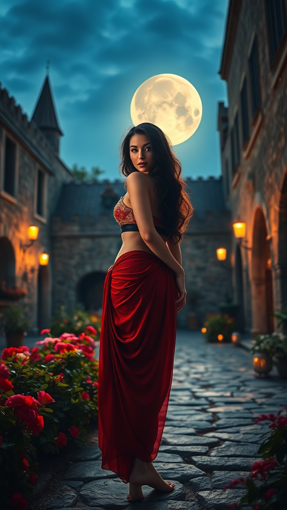In a medieval castle courtyard at dusk, radiant moonlight mingles with the warm glow of torchlight and candlelight, casting an enchanting aura around a captivating beauty. Her red and gold belly dancer's outfit shimmers in the ethereal light, highlighting her graceful form. The natural brightness of the full moon bathes her, accentuating her alluring pose as she stands barefoot among vibrant blooms. Her gaze, both mysterious and captivating, draws the viewer in. An elegant, black band adorns her neck, adding an air of mystique. Her raven-black hair, wavy and cascading to her hips, catches the soft, diffused light, illuminating the contours of her figure. With her back to the camera, she glances back over her shoulder, inviting engagement. Captured with a Leica M10 and Helios-44 58mm f/2 lens at F2.8, the photograph features deep, rich tones and exquisite highlights. The ambient light at dusk enhances her radiant demeanor, while her hair glistens in the gentle illumination, accentuating her sensuous silhouette.