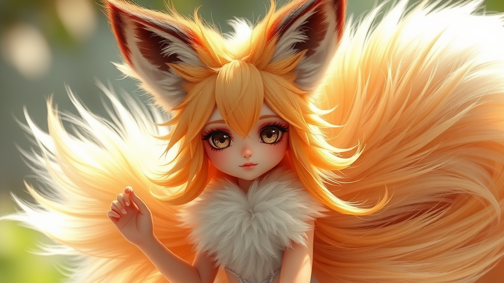 Fluffy nine-tailed fox girl, hyper-realistic photography style, professional 8k quality, soft natural lighting, CGI-inspired, 3D illustration blending elements of a doll and anime, digital art with a blend of cartoon aesthetic, digital painting attributes, enhanced detail, vivid yet subtle textures, enhanced skin features with lifelike details, hints of skin imperfections for realism, anatomically balanced portrayal, captivating and immersive visual storytelling, vibrant color palette, dynamic and expressive pose.