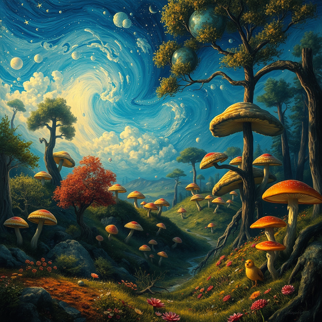 Enchanted landscape, fantasy masterpiece, painting of a magical woodland, ethereal glow, vibrant palette, surreal mushroom groves, soft illumination, intricately detailed, beyond reality, visualized through ultra-realistic CGI, reminiscent of Van Gogh’s style, ultra-high-definition, high dynamic range, ultra-crisp resolution, avoiding typical digital flaws like compression artifacts, low fidelity, and unwanted textual elements, ensuring clarity, focus, and seamless composition within the frame.