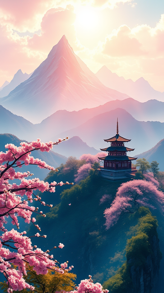A sweeping vista of a majestic Japanese landscape, rendered in the vibrant and fluid style reminiscent of Kingdom Hearts, with intricate ink brushwork. The scene is bathed in dramatic lighting, casting dynamic shadows across the serene yet epic scenery, capturing the harmonious balance of nature and architecture. Tall, ethereal mountains rise in the background, while cherry blossoms gently sway in the foreground, their petals dancing in the air. An ancient temple stands gracefully on a hill, exuding timeless elegance. The panoramic view is captured in stunning 8k resolution, with a 3:2 aspect ratio, allowing for a breathtaking depiction of this enchanting and otherworldly realm.